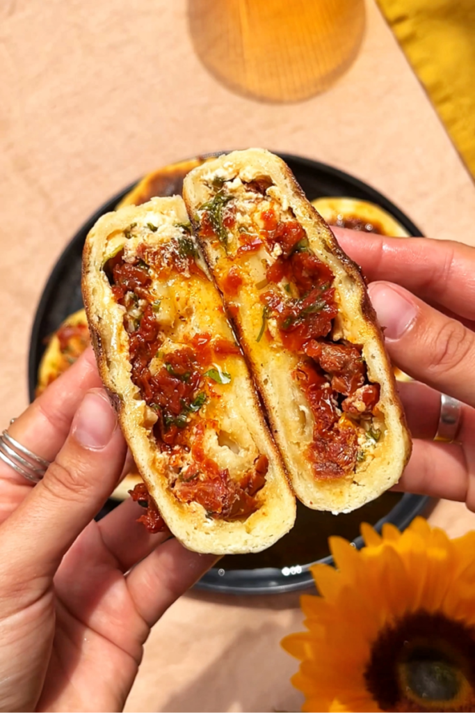 Flatten gently and roll into a stuffed flatbread.