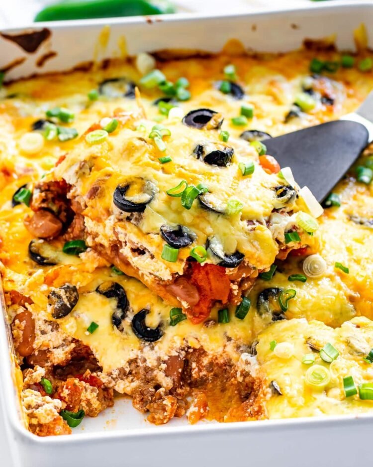 Grease a 9×13 casserole dish. Put down a layer of crushed tortilla chips, followed by a layer of the meat/bean mixture, then half of the cheddar cheese. Repeat layers.